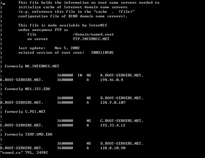 此檔案內容由ftp://rs.internic.net/domain/named.root來下載最新檔案。檔案內容則複製所下載的named.root內容即可,不需做任何改變。下圖為”named.ca”部分內容: