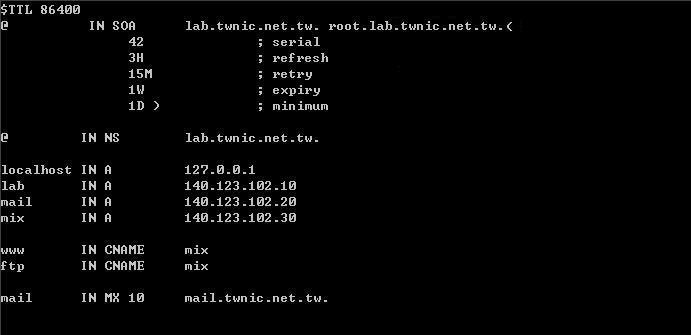 提供ftp及www服務的主機皆為mix(IP為140.123.102.30),因此利用”CNAME”來設定mix主機的別名分別為www和ftp。 最後則設定擔任郵件伺服器的主機。