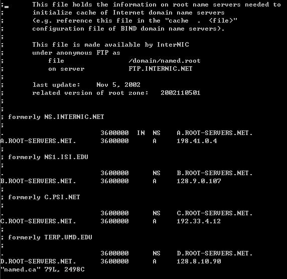 此檔案內容由ftp://rs.internic.net/domain/named.root來下載最新檔案。檔案內容則複製所下載的named.root內容即可,不需做任何改變。下圖為”named.ca”部分內容: