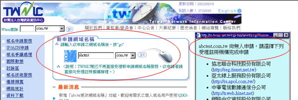 可從TWNIC的首頁查詢欲申請的網址是否還可申請,或到各受理註冊機構網頁亦可直接查詢。