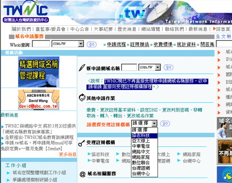 TWNIC現已不再直接受理新申請網域名稱服務,欲申請者請 直接向受理註冊機構辦理