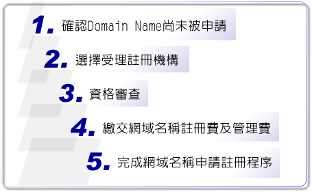 依照各受理註冊機構的頁面輸入各種資料申請。大致的順序如下: