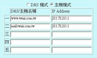 如果您申請 twnic.com.tw 的網域名稱,同時您申請了 ADSL 固接線路,您有一個 固定 IP 211.72.211.1,您並未架設 Domain Name Server,但您用架設了一個 WEB server ,您希望別人用 網址 http://www.twnic.com.tw 連上您的網頁,且如果您又同時啟動Mail Server ,您想用它來收送電子郵件,可是又不想用 www.twnic.com.tw 當作電子郵件地址,您想用 XXXX@mail.twnic.com.tw 當作您的電子郵件地址,那您的主機模式設定如下。