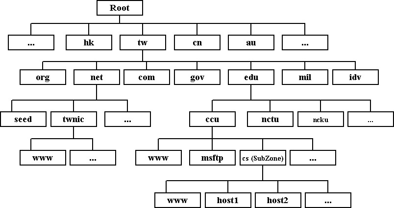 DNS系統基本是採樹狀階層式(hierarchy)的架構。網際網路上有十來個最上層的頂層root DNS servers,在這些系統中,記錄著所有最頂層( Top Level Domain,以下簡稱TLD ),TLD DNS servers的資料,經由這些最頂層負責的DNS servers,我們可以從root DNS servers一層一層,一路往下。找到各domain zone實際負責的(authoritative)DNS servers。(所謂的TLD,就像"tw."表臺灣,"cn."表中國大陸,...)